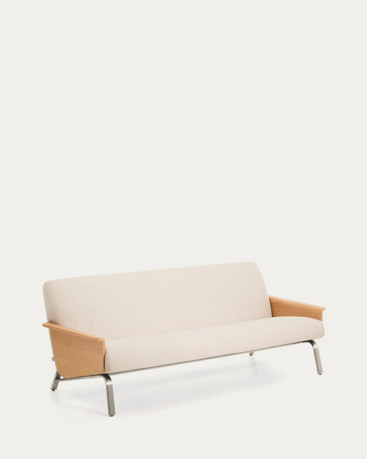 - 3-seater sofa with plywood armrests with oak veneer, chenille upholstery and brushed stainless steel legs.