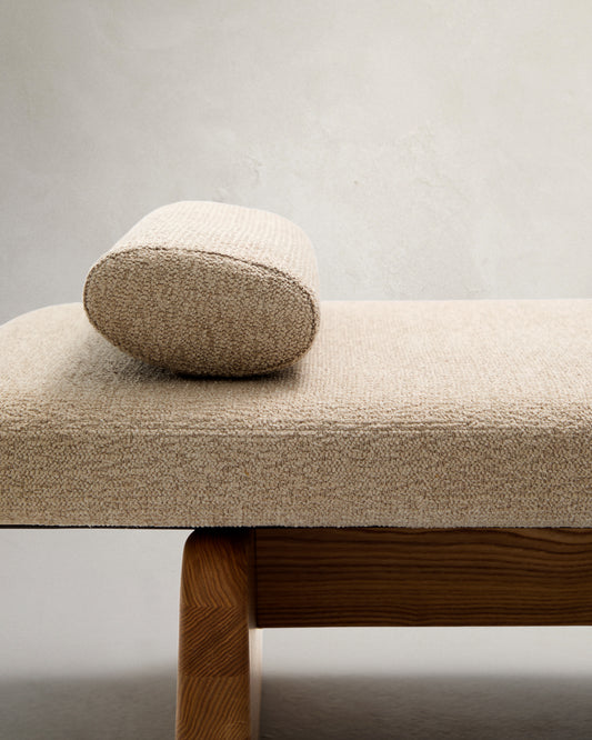 - Divan upholstered in a thick, beige chenille fabric with recycled polyester.