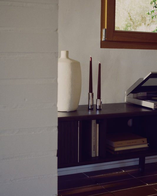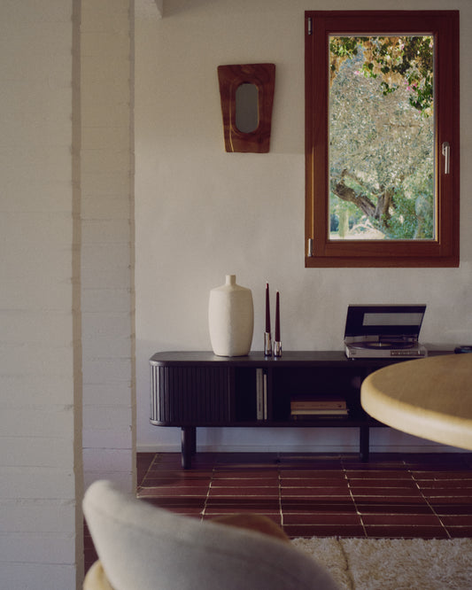 - 2 sliding doors made of wooden slats to hide or show the inside of the sideboard.