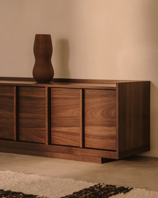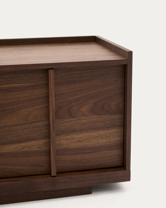 - TV stand made with a walnut veneer in a dark finish.