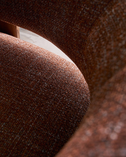 - Armchair upholstered in thick, two-tone brown chenille with recycled polyester and solid ash wood legs in a walnut finish.