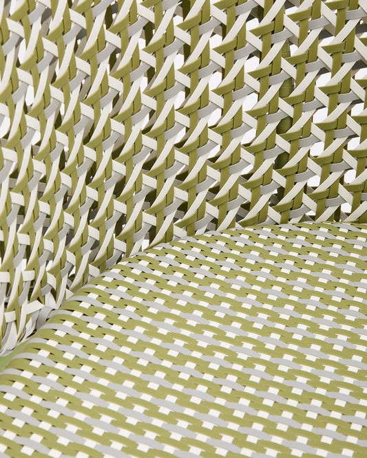 - 알루미늄 구조와 핸드메이드 인조 라탄으로 만든 행잉 암체어.