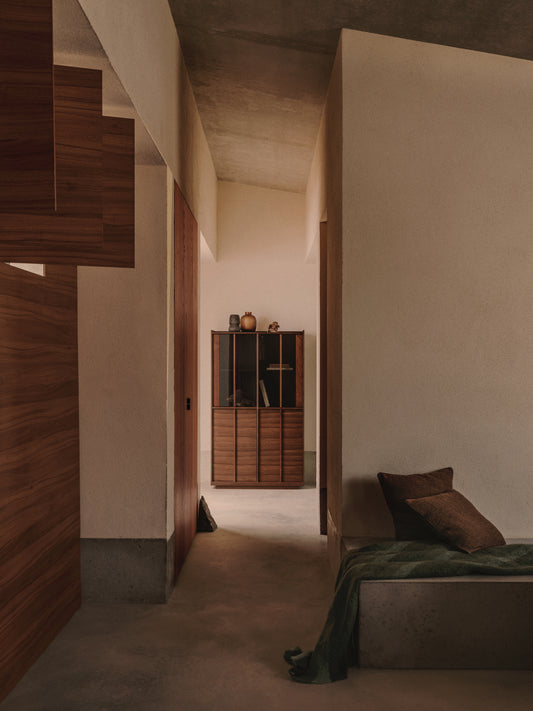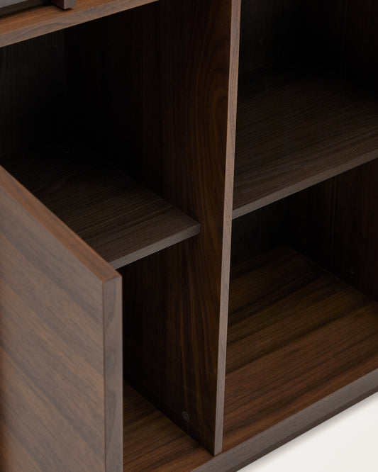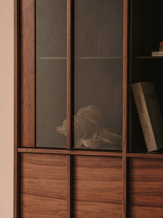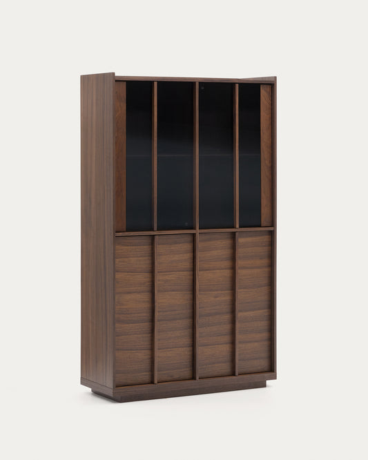 - 다크 월넛 베니어 마감의 월넛 원목 디스플레이 캐비닛.