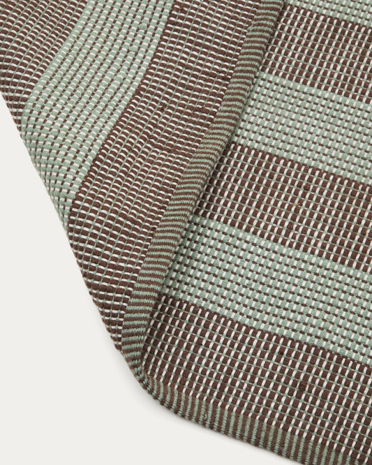 - Handwoven bicolor striped rug made from 100% recycled PET fibers.